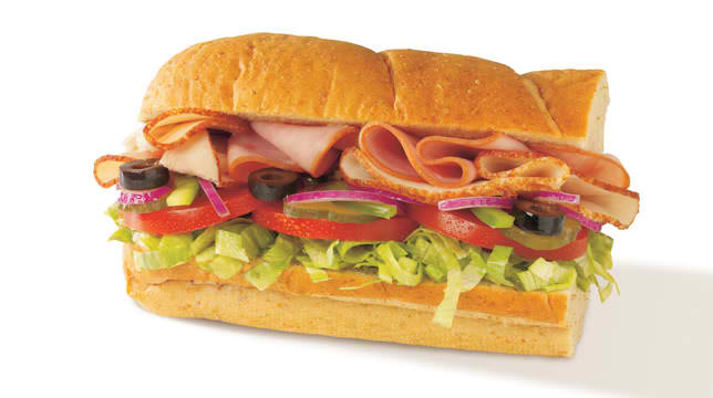 Values include wheat bread, lettuce, tomatoes, onions, green peppers, pickles and olives.